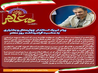 استاندار چهارمحال و بختياري در پيامي 12 ارديبهشت روز معلم را تبريک و سالروز شهادت استاد مطهري را گرامي داشت.